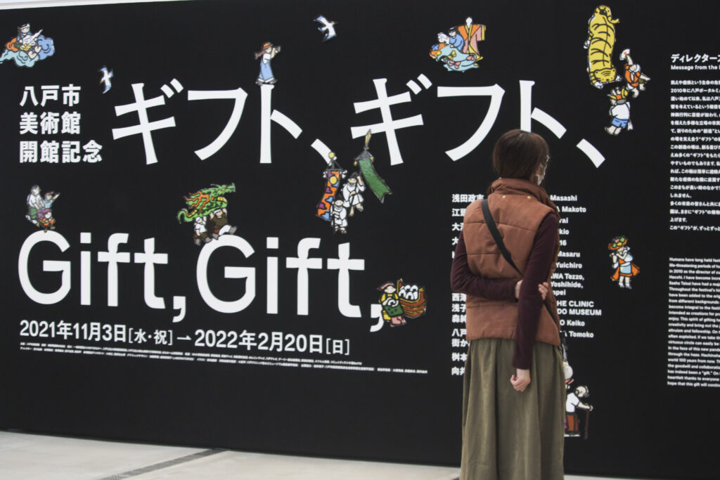 人類学者マルセル・モースは『贈与論』(1925)のなかで、「贈る」「受け取る」「お返しする」ことの循環によって成り立つ未開社会の交換儀礼や、人や集団の関係性を保つ互酬的なやりとりを“贈与=ギフト” ととらえました。この企画における“ギフト” もまた、モースが述べた経済行為では手に入らない「もの」や「こと」、そのやりとりを指しています。その特徴には、自分が受けた恩をその贈り主ではなく、次の誰かに時を超えて返していく性質があり、「ギブ&テイク」や「win-win」よりも拡張的、循環的な意味を込めて、タイトルを「ギフト、ギフト、」としました。八戸三社大祭に見られる、誰もが「贈り手」であり「受け手」であるようなあり方は、右肩上がりの成長に幸せを求める時代から変化した現代社会に示唆を与えるとともに、私たちの美術館が目指すアートのあり方と重なるものとなります。
