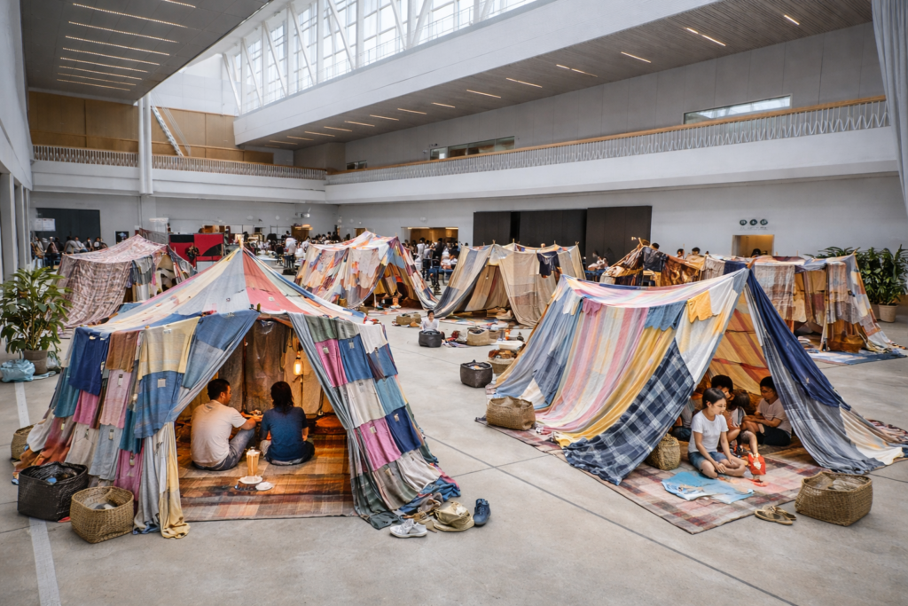 また、美術館のジャイアントルームを避難所に見立て、集めた服をパッチワークにして避難テントをつくります。